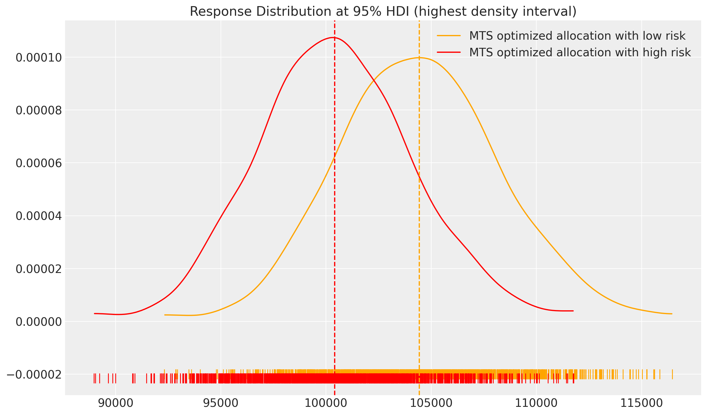 The optimizer is once again allocating the budget to \(X1\) majority, nevertheless \(X2\) it’s getting more money this time. However, this decision is informed by the expectation that the current combination will yield a higher Return on Advertising Spend (ROAS), while also presenting a small lower risk profile compared to the previous allocation.